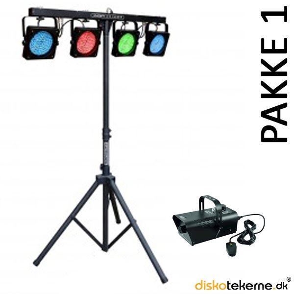 En lille simpel pakke med diskolys og røg til den mindre fest. Lamperne kan indstilles til bl.a. at lyse konstant farve eller at skifte farver i takt til musikken automatisk.