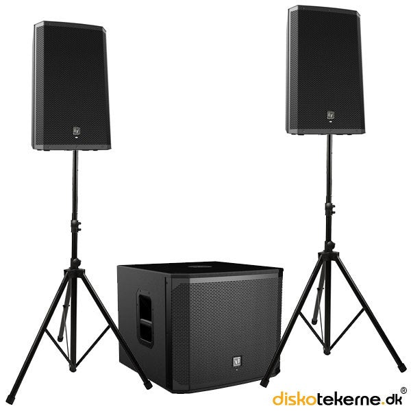Dette medium-størrelse musikanlæg/højttaleranlæg spiller let op til en fest for 50-80 mennesker. Pakken består af to super gode tophøjttalere og en kraftig subwoofer.