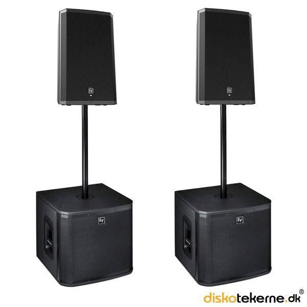 Dette medium-størrelse musikanlæg/højttaleranlæg spiller let op til en fest for 70-100 mennesker. Pakken består af to super gode tophøjttalere og to kraftige subwoofere.